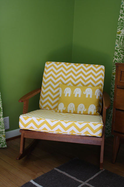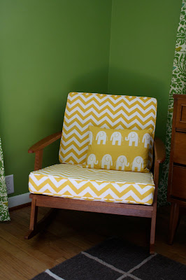 Another yellow and white chevron redo, Jen made her own slipcovers for this pretty little nursery rocker.