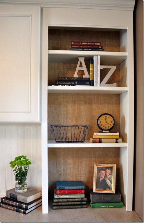 Who knew cornstarch could be used to stick fabric to a bookshelf? It does. The burlap is still held firmly in place almost a year later. I still love the texture and color the burlap brings to the space.